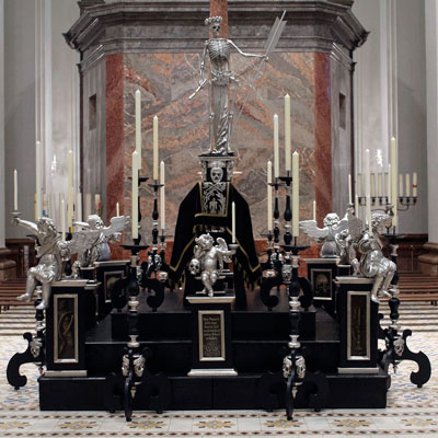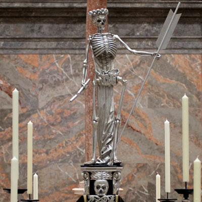 aufgestellt. Sie ist eine 3-stufige Anlage aus der Mitte des 18. Jahrhunderts, in schwarz gefasst und teilweise versilbert. Oben aufstehend ist der Sarkophag (griech. Fleischfresser) mit dem Silber besticktem Bahrtuch bedeckt. Bekrönt wird die Darstellung von einem versilberten Skelett (Tod), einen Pfeil und eine abgebrannte Fackel haltend. Auf der Stufenanlage stehen 8 Postamente mit Silber gerahmten Bildern von Schädeln und Knochen. Darauf leuchtertragende Engel. Rundum 12 gedrechselte Kerzenleuchter mit geschweiften Volutenfüßen.