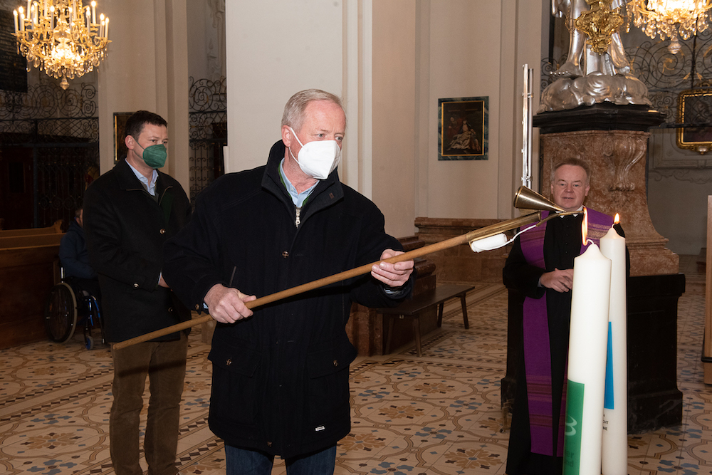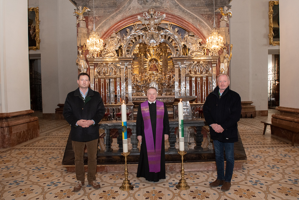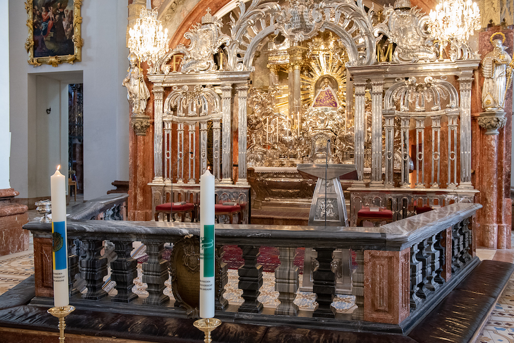 NÖ-Bauernbund Direktor Ing. Paul Nemecek und Bürgermeister Walter Schweighofer entzündeten am 12. März 2022 zwei Votivkerzen für den Frieden in der Ukraine vor der Gnadenmutter in Mariazell, welche auch seit Jahrhunderten als Mater gentium Slavorum, als Schutzherrin der slawischen Völker, verehrt wird.