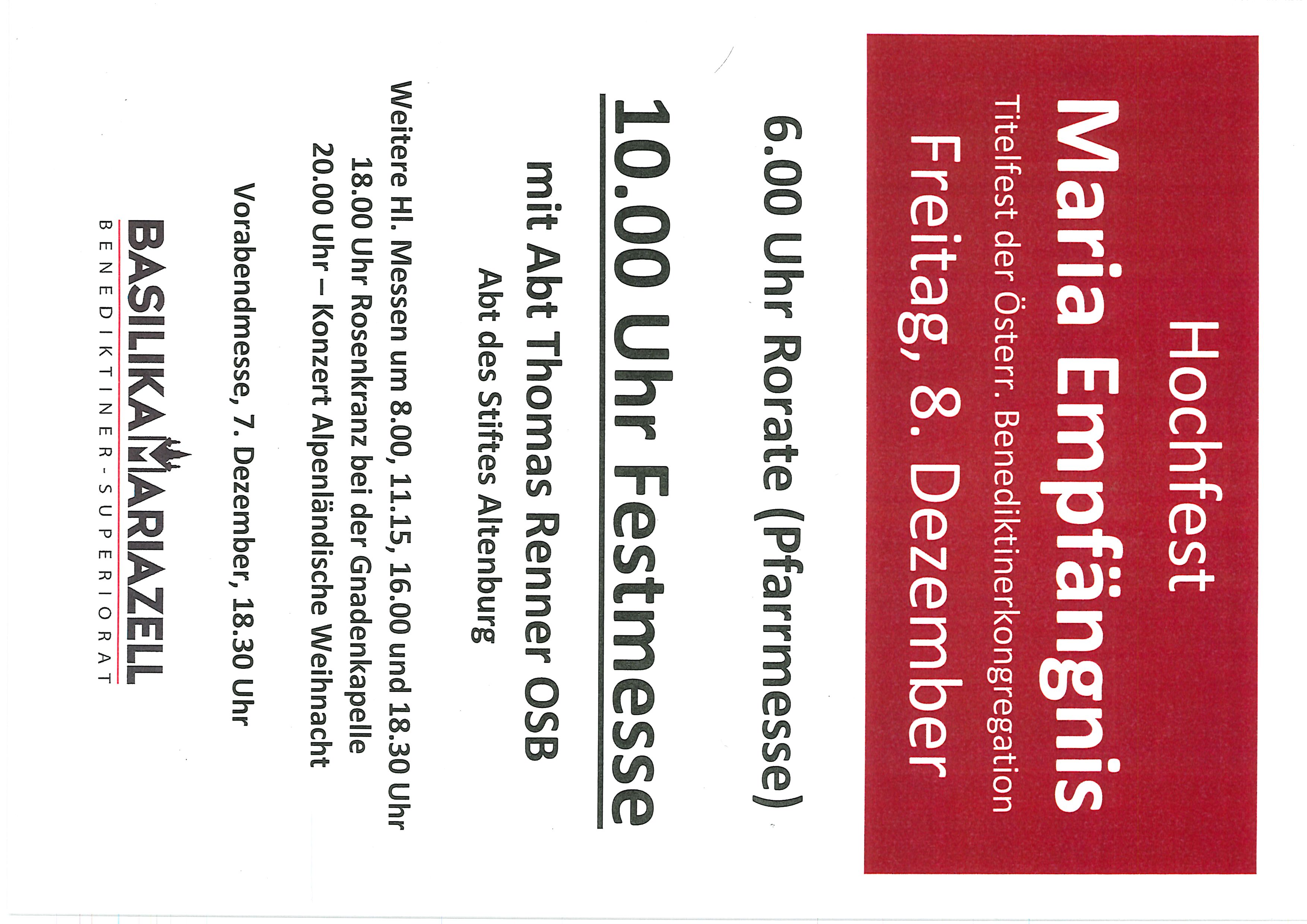 Zu den Feierlichkeiten zum Mariazeller Patrozinium am 8. September pilgern traditionell hunderte Menschen in den österreichischen Wallfahrtsort. Vor genau 15 Jahren pilgerte Papst Benedikt der XVI nach Mariazell, dessen Besuch in der heutigen Festmesse gedacht wurde. Abt Benedikt reiste zu diesem festlichen Anlass aus dem Mutterkloster Sankt Lambrecht an um gemeinsam mit Superior Pater Michael, Pater Christoph, Pater Vaclav und zahlreichen Pilgern die Fesetmesse zu zelebrieren.